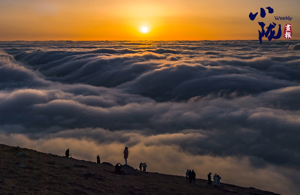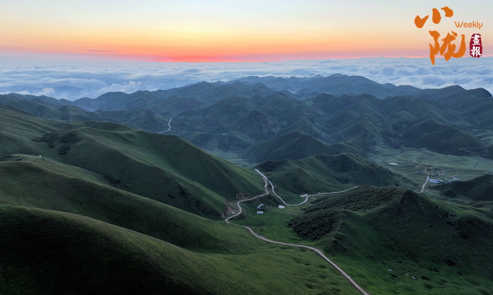 登頂望遠(yuǎn),千壩草原高山、草甸、草原相互交織,牛馬、羊群像一顆顆散落的珍珠點綴其中。茫茫云海鋪滿整個天際,翻涌的流云大河奔騰,蔚為壯觀,如臨于大海之濱。
