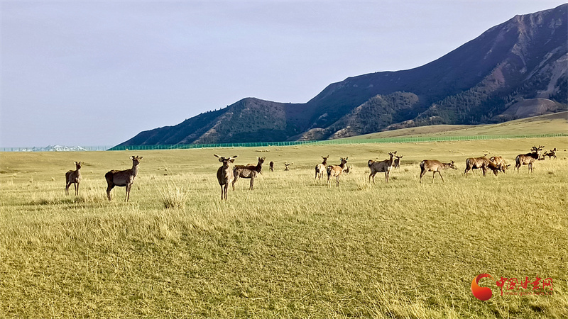 初夏的肅南大河草原牧草逐漸返青,一群群馬鹿在草原上悠閑覓食,游客到來并沒有打擾它們的正常活動。