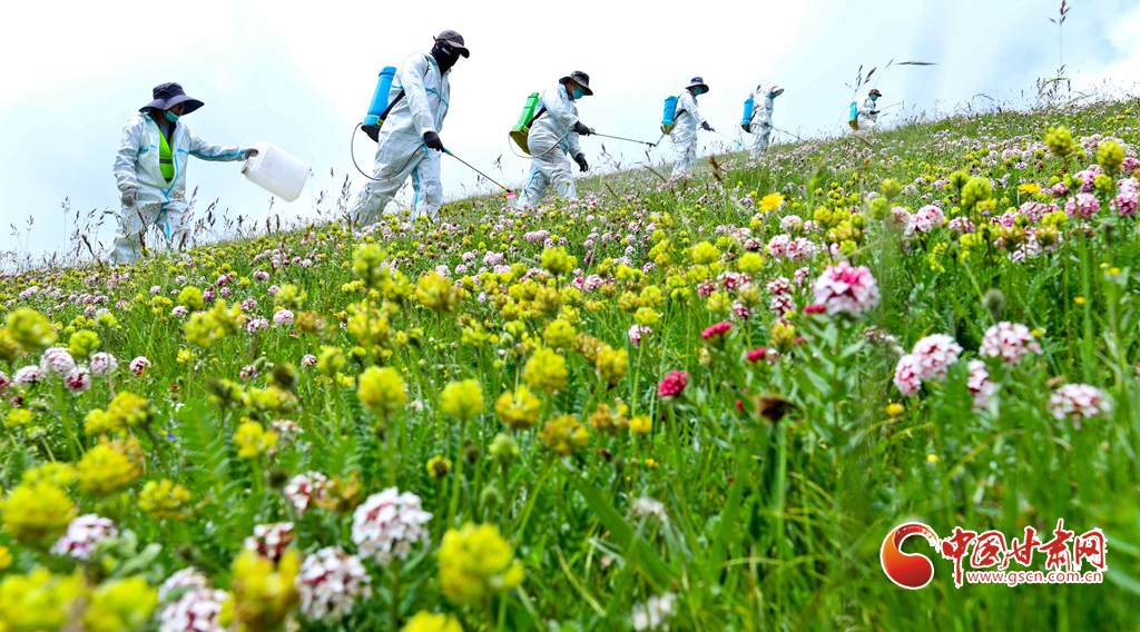 盛夏時節(jié),位于張掖市肅南裕固族自治縣的皇城夏日塔拉草原、康樂賽汗塔拉草原,宛如一塊巨大的綠色絨毯鋪向天際,滿目翠綠,令人心醉神迷。然而,此時也正是草原上狼毒花毒害草盛放、蝗蟲繁殖的高峰期。連日來,肅南縣林草專業(yè)技術人員帶領2000多牧民,抓住毒害草開花、蝗蟲繁殖最快,也是清除滅殺的最佳時機,在“三北”工程六期160多萬畝廣袤的草原上,打響了以“蟲害防治+害草治理+噴施葉面+播撒草籽的”為核心的“三北”工程林草濕荒一體化保護修復攻堅戰(zhàn)。