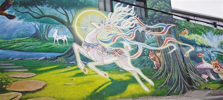這些色彩斑斕的墻繪以城關區(qū)深厚的文化底蘊為底色,將民俗風情、自然生態(tài)與城市記憶巧妙交織。在伏龍坪街道,一面巨幅“舞獅”墻繪氣勢恢宏,紅黃相間的獅子昂首騰躍;在山間步道旁,“九色鹿”悠然立于云霧之間,靈動雙眸映照山河,將敦煌文化的神秘與自然之美娓娓道來。