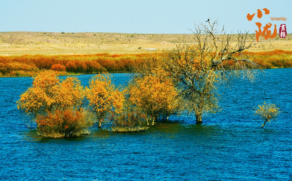 金色胡楊在陽(yáng)光下泛著溫暖光澤,斑斕絢麗的蘆葦如金色絲帶點(diǎn)綴荒漠,與碧綠河水、湛藍(lán)天空構(gòu)成濃墨重彩的秋日?qǐng)D景。