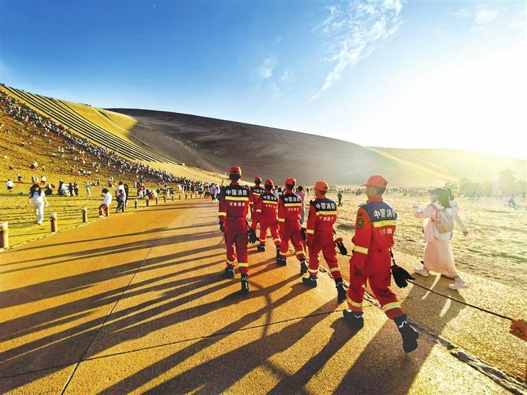 敦煌市消防救援大隊(duì)指戰(zhàn)員在鳴沙山月牙泉景區(qū)開展流動(dòng)執(zhí)勤。