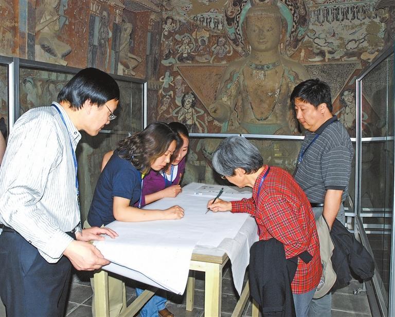 樊錦詩帶領(lǐng)項目團隊在莫高窟第275窟核對石窟考古報告測繪圖。