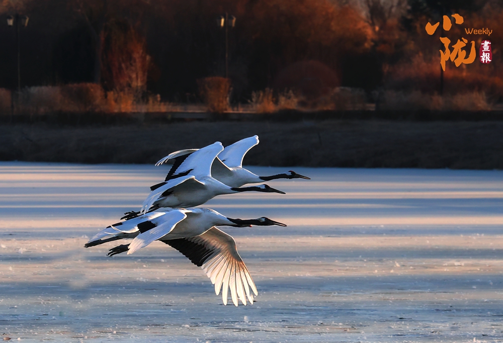冰面映照著澄澈藍(lán)天,丹頂鶴展翅掠水,引頸高歌,清脆的鳴叫聲仿佛是大自然奏響的美妙樂(lè)章。