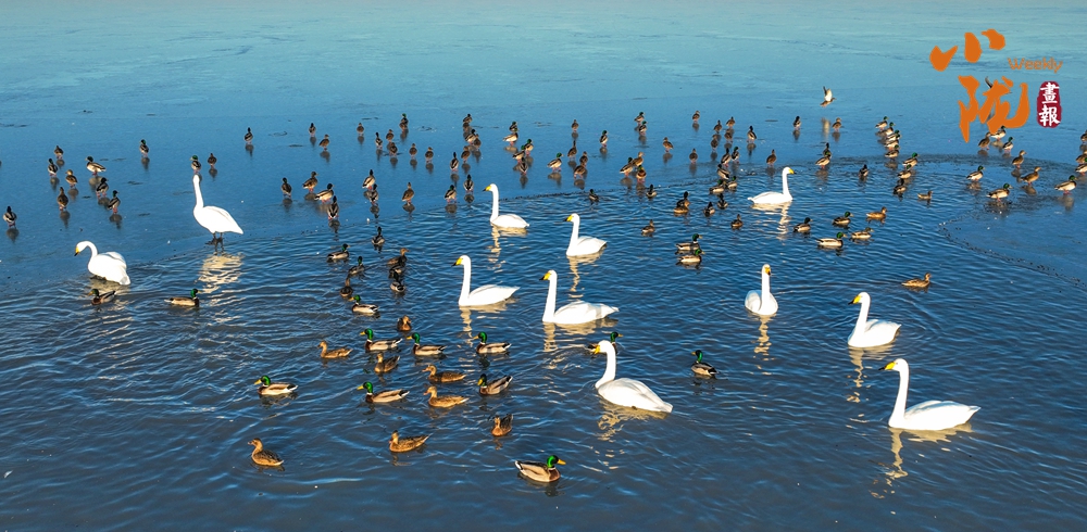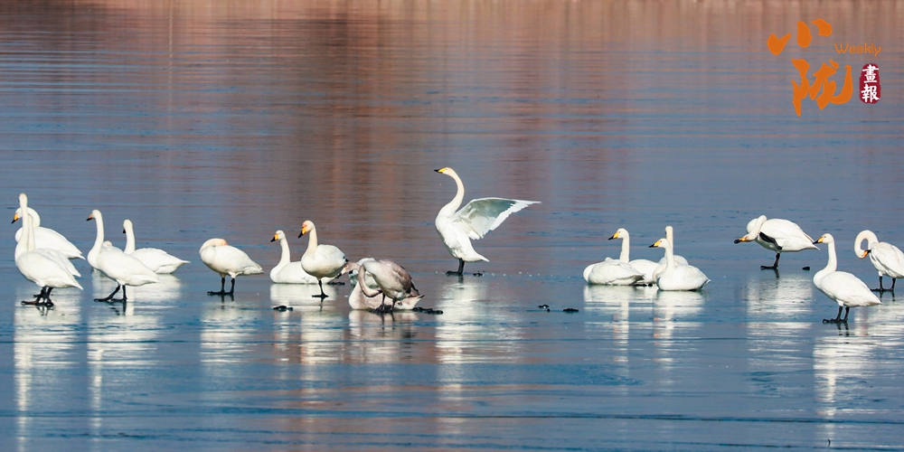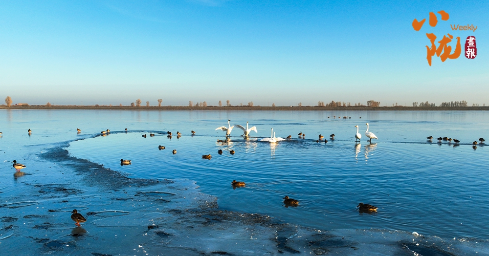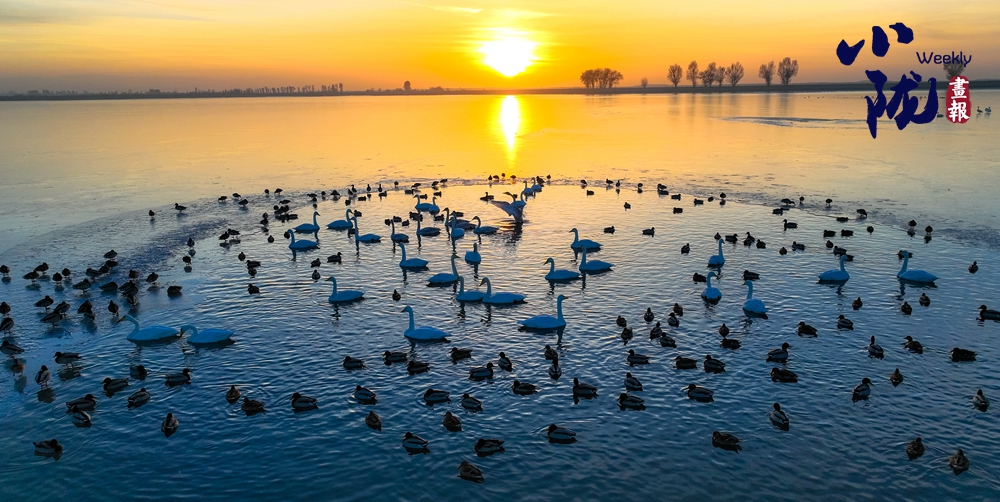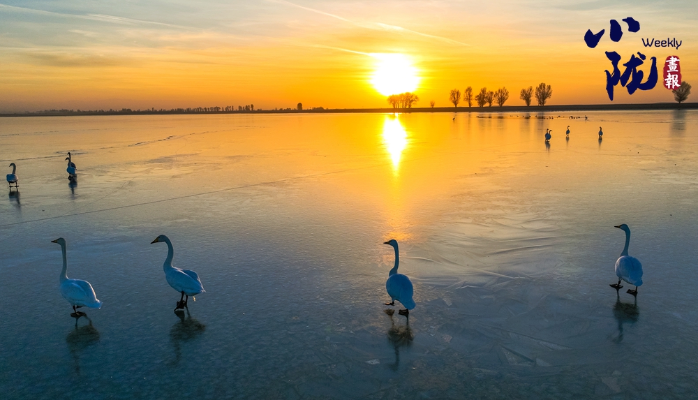 陽光斜照,萬物生暖。水面上,成群的白天鵝不緊不慢地游著,雪白的身影倒映水中,隨著微波輕輕蕩漾,像是一幅流動的水墨畫,素雅而安寧。
