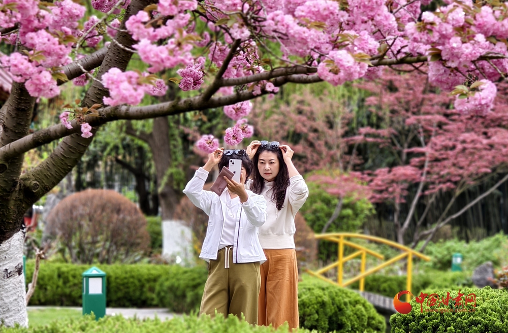 4月10日,在金徽酒文化生態(tài)旅游景區(qū)櫻花大道,游客拍照留念,定格美好春光。